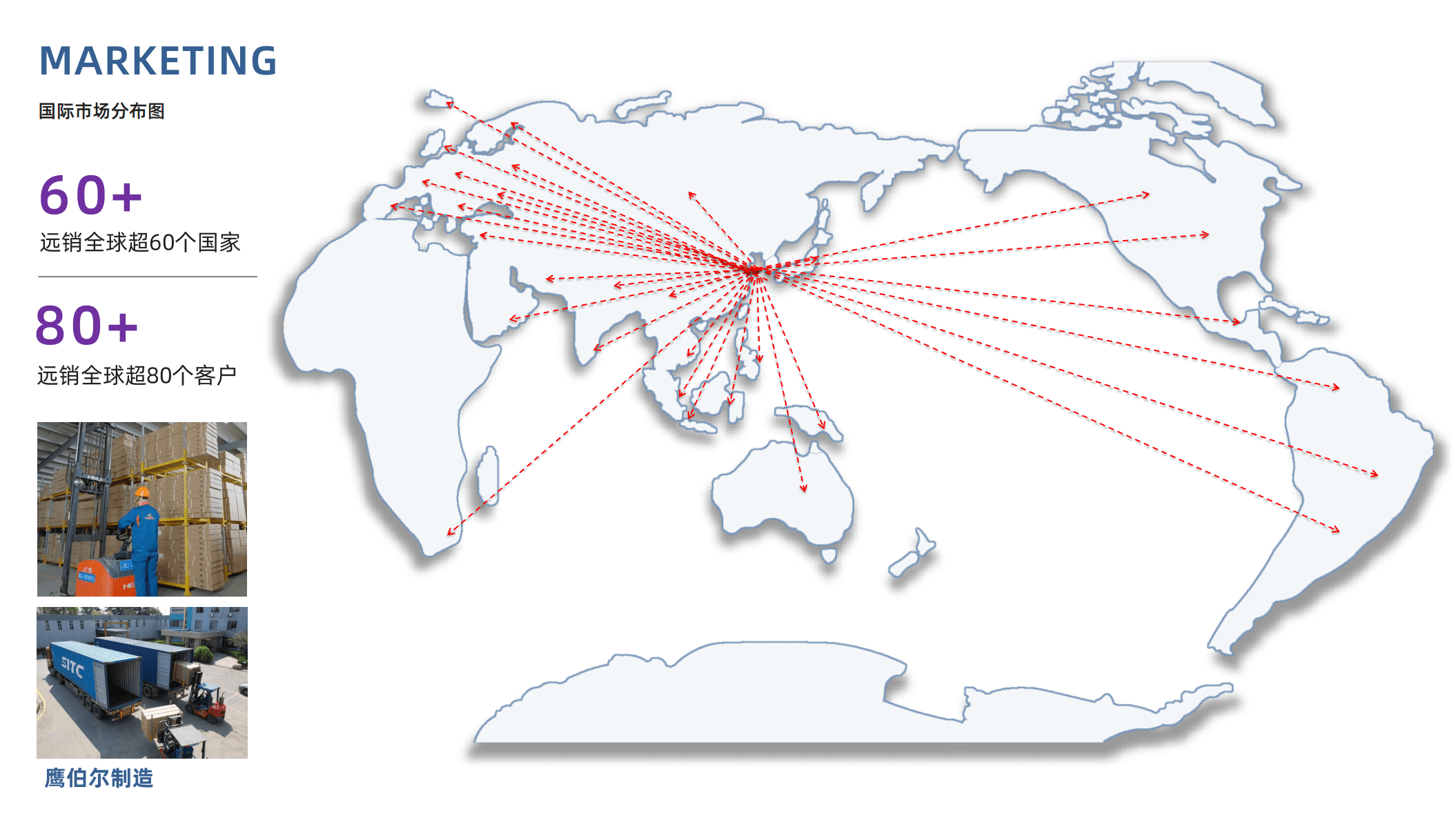 公司产品出口美国、欧洲及亚洲等80多个国家和地区,并长期行销全国20多个省市和自治区。公司自成立以来,先后获得了 “沃尔玛优秀国际供应商”、“中国出口企业成就奖”、“全国先进外商投资企业”、“省级守合同,重信用企业” 等荣誉证书。经过多年发展,国内外市场不断扩大,经济效益逐年增长,已成长为国内力量健身器材行业的专业制造和引领者。